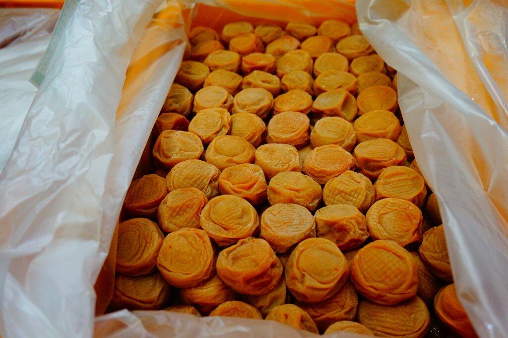 写真のように、専用の「サンボックス」で仕入れます。(長方形の平たいケース。梅干しを重ねすぎないようにし、梅干しの潰れを少なくしています。)